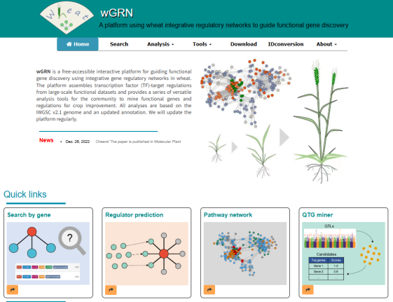 ☆?利用整合基因調控網(wǎng)絡探索小麥功能基因的交互式平臺wGRN:提供了基因調控查詢、功能基因預測和QTG挖掘等十余個功能模塊,建立了小麥整合基因調控網(wǎng)絡,實現(xiàn)了可持續(xù)整合大規(guī)模調控數(shù)據(jù)集的網(wǎng)絡化研究框架。