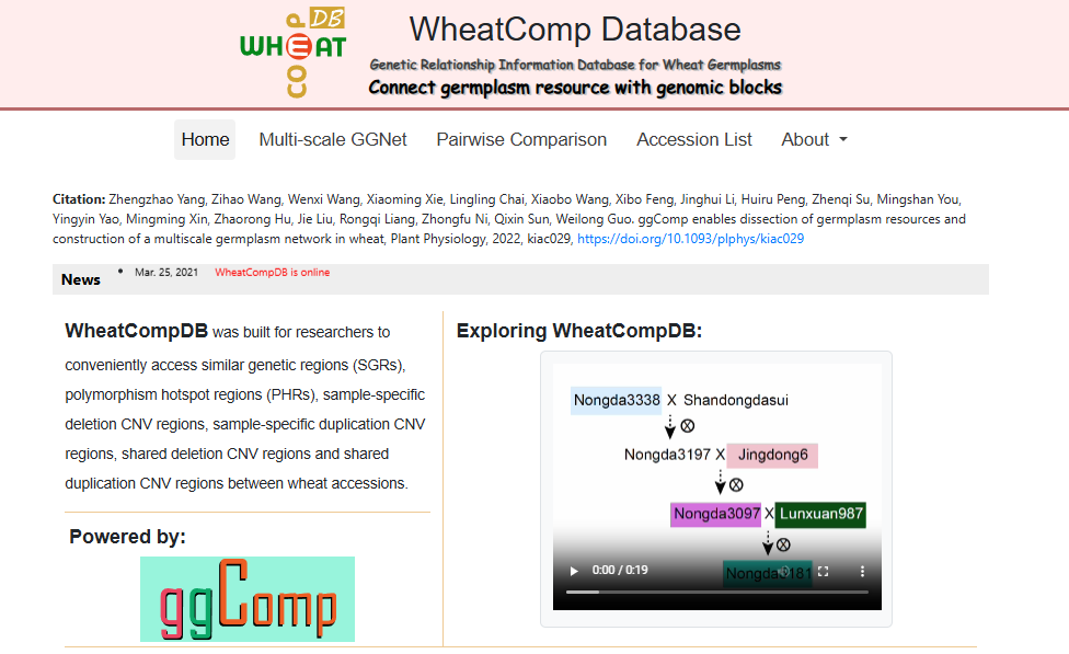 ☆?小麥種質資源血緣區(qū)間比較數(shù)據(jù)庫WheatCompDB:主要針對數(shù)據(jù)集中任意兩個樣本間的種質資源血緣區(qū)間比較分析,支持基因組水平、染色體水平和局部區(qū)間水平下種質資源網(wǎng)絡的構建和挖掘。