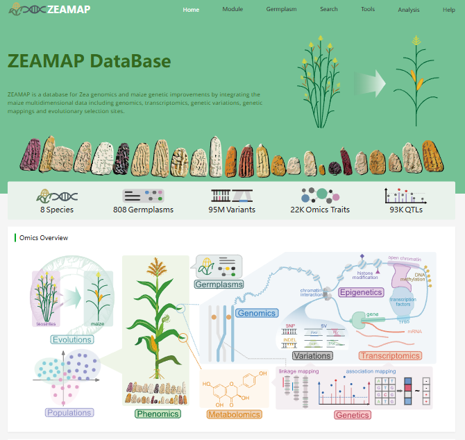 ☆?適應玉米多組學時代的綜合數(shù)據(jù)庫:整合了來自于同一玉米群體的基因組、轉錄組、表型組、代謝組、表觀基因組、遺傳變異以及遺傳定位結果等多組學數(shù)據(jù),同時收錄了多個玉米基因組,可以進行比較基因組、共線性分析、表達聚類、遺傳變異基因分型、連鎖圖譜、定位結果、組蛋白修飾以及甲基化等多組學數(shù)據(jù)進行檢索和分析,實現(xiàn)在不同組學數(shù)據(jù)之間進行跳轉。