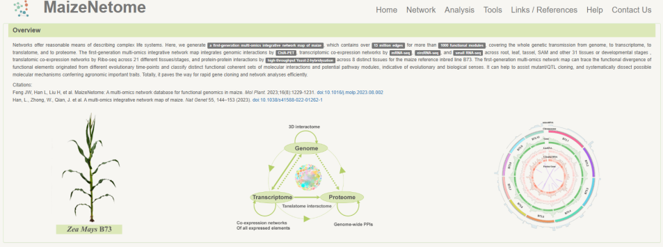 ☆?玉米網(wǎng)絡數(shù)據(jù)庫MaizeNetome:其中包含從基因組到轉錄組、翻譯組和蛋白質組的整個遺傳傳遞。多組學整合網(wǎng)絡圖譜通過ChIA-PET整合基因組相互作用,包括跨根、葉、穗、?SAM和其它31個組織或發(fā)育階段mRNA-seq、circRNA-seq?的轉錄組共表達網(wǎng)絡,跨?21?個不同組織/階段Ribo-seq?數(shù)據(jù),?B73?材料8?個不同組織的酵母雜交蛋數(shù)據(jù)。數(shù)據(jù)庫可以幫助輔助QTL定位,并系統(tǒng)剖析農(nóng)藝性狀的可能分子機制,為快速基因克隆和高效的網(wǎng)絡分析鋪平道路。