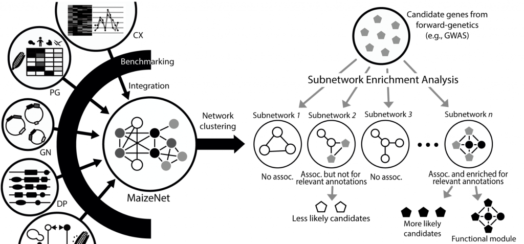 ☆?全基因組范圍的玉米基因輔助功能網(wǎng)絡數(shù)據(jù)庫MaizeNet:是通過集成?21?個組件網(wǎng)絡構建的,其中每個網(wǎng)絡都是從不同的組學數(shù)據(jù)中推斷出來的。 通過整合異構數(shù)據(jù),MaizeNet?提供了玉米遺傳結構的全面視圖,為特定生物過程確定候選基因的優(yōu)先級。可以利用?MaizeNet?中實現(xiàn)的優(yōu)先級服務來生成新的功能假設,縮小候選基因的范圍,并確定該功能的新基因。