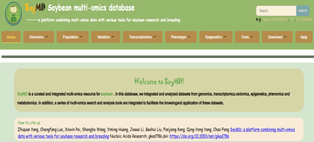 ☆?大豆多組學數(shù)據(jù)庫SoyMD:共提供了8個組學模塊以方便用戶瀏覽和分析多組學數(shù)據(jù),包括基因組、轉錄組、表觀基因組、表型組、變異組、工具、下載和幫助模塊。