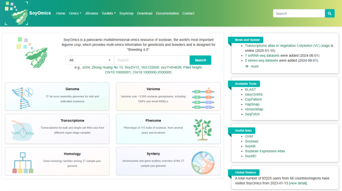 ☆?大豆多組學數(shù)據(jù)庫SoyOmics:從基因組、變異組、轉錄組、表型組等不同層面整合了大豆相關數(shù)據(jù)集,實現(xiàn)了不同層次組學數(shù)據(jù)的交互查詢和聯(lián)合比較分析。數(shù)據(jù)庫目前收錄了多個大豆品系的基因組組裝,注釋數(shù)據(jù),以高質量的ZH13作為參考基因組,對2898份材料的全基因組測序數(shù)據(jù)進行了全基因組序列變異檢測,鑒定到約3800萬條SNP/INDEL變異數(shù)據(jù),提供了來自大豆泛基因組分析的約55萬條結構變異數(shù)據(jù)以及基于結構變異構建的圖泛基因組。收錄了多個品系不同組織時期的表達數(shù)據(jù)。數(shù)據(jù)庫針對115個表型多年多點測定的約2.7萬條表型記錄進行了本體注釋和歸類,并將表型數(shù)據(jù)與變異數(shù)據(jù)進行關聯(lián)。除以上組學數(shù)據(jù)外,數(shù)據(jù)庫同時提供了甲基化測序數(shù)據(jù),Soy40K大豆芯片數(shù)據(jù)。
