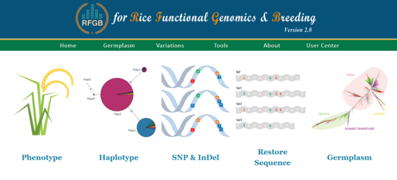 ☆?水稻功能基因組育種數(shù)據(jù)庫RFGB(v2.0):該數(shù)據(jù)庫整合了3024份水稻種質資源的18M SNP、2.3M InDel、IRGSP所有基因單倍型和12種表型數(shù)據(jù),具有基因檢索、基因組變異可視化瀏覽、BLAST等功能,將表型數(shù)據(jù)和單倍型數(shù)據(jù)聯(lián)合分析,為挖掘基因有利單倍型提供數(shù)據(jù)支持。