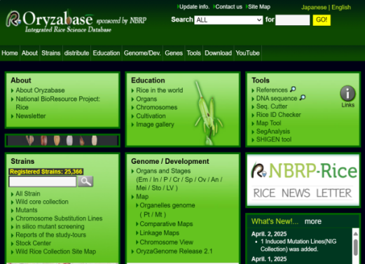 ☆?Oryzabase是一個綜合性水稻科學數(shù)據(jù)庫,包含大量水稻品系庫存信息,突變體信息,染色體圖譜,基因字典,水稻科學基礎知識。OryzaGenome是野生Oryza物種的基因組數(shù)據(jù)庫,為水稻研究提供了比較和進化的組學方法。