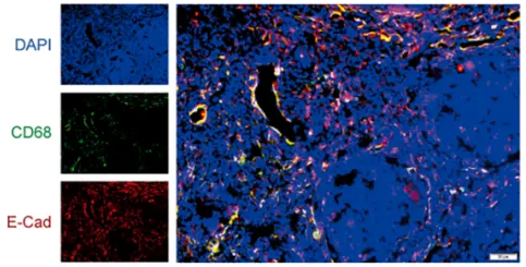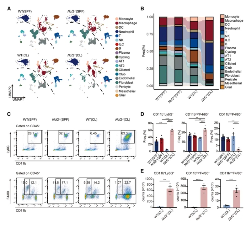 通過(guò)不同環(huán)境暴露(SPF或CL)實(shí)驗(yàn),系統(tǒng)研究了環(huán)境病原體對(duì)CGD遺傳背景小鼠表型的影響。表現(xiàn)為HE染色全肺葉顯微圖像可見(jiàn)CL環(huán)境下的Ncf2?/?小鼠肺部出現(xiàn)明顯的肉芽腫結(jié)構(gòu),伴隨炎癥細(xì)胞浸潤(rùn)和組織壞死,其他組小鼠肺部正常。免疫熒光顯示肉芽腫中的巨噬細(xì)胞(CD68+)表達(dá)上皮標(biāo)志物E-cadherin,提示巨噬細(xì)胞發(fā)生上皮樣轉(zhuǎn)化。通過(guò)ELISA法檢測(cè)CL?Ncf2?/?小鼠血清中的IL-1β和IFN-γ炎癥相關(guān)蛋白水平較CL?WT組增加。16S?rRNA/ITS?測(cè)序顯示CL?Ncf2?/?小鼠肺部細(xì)菌(如克雷伯菌和葡萄球菌)和真菌(如Talaromyces)負(fù)荷顯著增加。