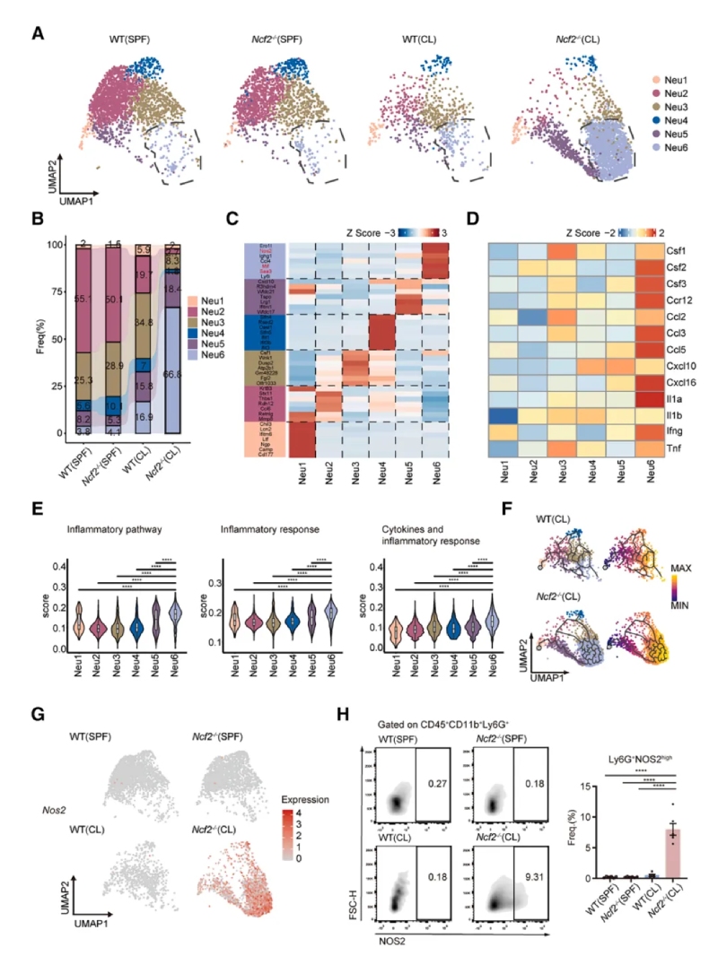 研究顯示,中性粒細(xì)胞分為6個(gè)亞群,其中Neu6亞群在CL?Ncf2?/?小鼠中顯著擴(kuò)增且Neu6高表達(dá)促炎基因(如Nos2、Mif、Tnf、Il1b)。NO是一種在病原體清除過(guò)程中起關(guān)鍵作用由NOS2合成的可擴(kuò)散小分子,CL?Ncf2?/?小鼠肺部的總NO生成量顯著升高。流式驗(yàn)證顯示CL?Ncf2?/?小鼠肺中NOS2high中性粒細(xì)胞比例顯著增加。這些結(jié)果均提示NOS2high中性粒細(xì)胞通過(guò)產(chǎn)生一氧化氮(NO)和促炎因子,驅(qū)動(dòng)肉芽腫核心區(qū)的炎癥反應(yīng)。
