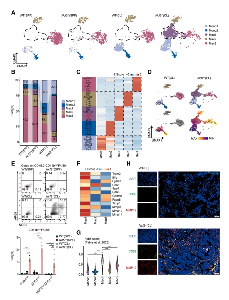 通過(guò)對(duì)巨噬細(xì)胞亞群進(jìn)行聚類分析和功能富集,發(fā)現(xiàn)巨噬細(xì)胞分為5個(gè)亞群,Mac1亞群在CL?Ncf2?/?小鼠中顯著增加。Mac1同時(shí)表達(dá)M1(Nos2)和M2(Arg1)標(biāo)志物,以及促纖維化基因(如Mmp12、Spp1)。免疫熒光顯示MMP12+巨噬細(xì)胞特異性分布于肉芽腫外圍。以上結(jié)果提示MMP12+巨噬細(xì)胞具有混合表型,可能通過(guò)細(xì)胞外基質(zhì)重塑促進(jìn)肉芽腫的纖維化包裹。