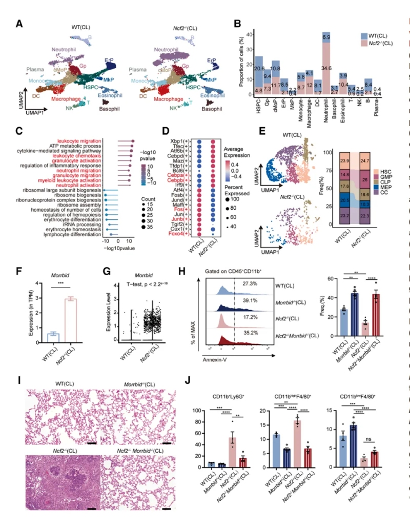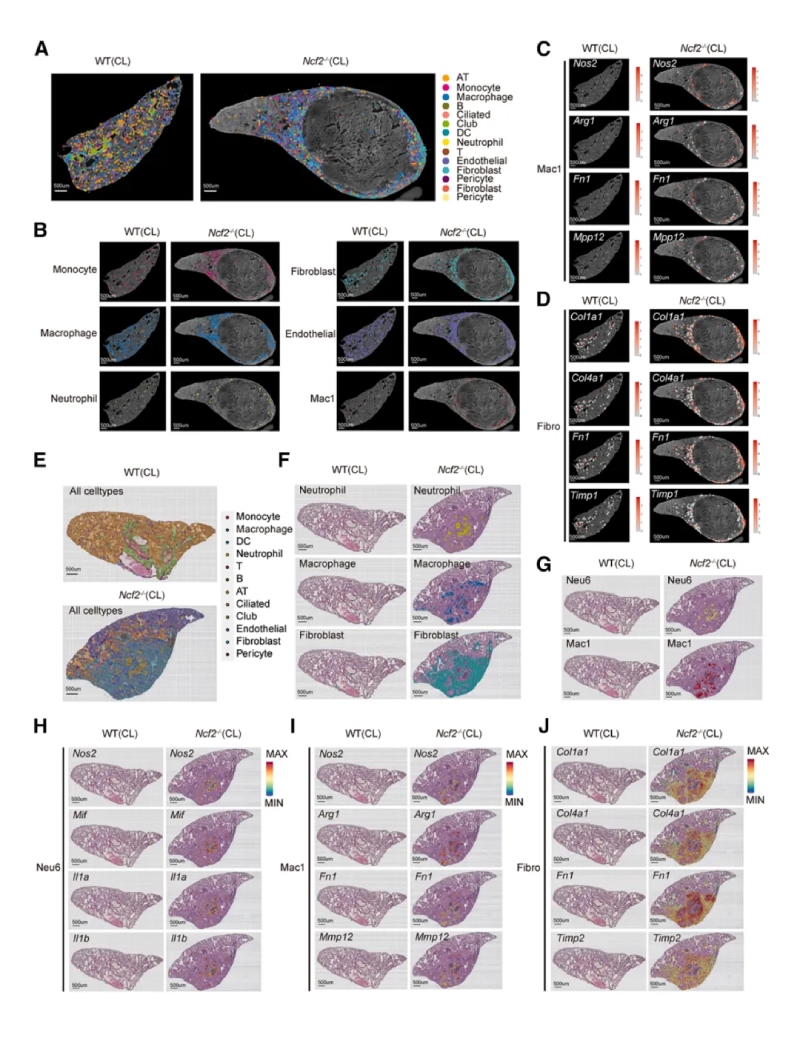 慢性肉芽腫病(Chronic?Granulomatous?Disease,?CGD)是一種由NADPH氧化酶2(NOX2)復(fù)合體功能缺失突變引起的原發(fā)性免疫缺陷病。這種缺陷會(huì)導(dǎo)致產(chǎn)生ROS的多種先天免疫細(xì)胞受到損害,機(jī)體抵御微生物的能力下降,導(dǎo)致CGD患者易發(fā)生反復(fù)感染和過(guò)度炎癥反應(yīng)。本研究通過(guò)構(gòu)建自然CGD小鼠模型,結(jié)合單細(xì)胞轉(zhuǎn)錄組(scRNA-seq)和空間轉(zhuǎn)錄組技術(shù)(包括BMKMANU?S1000平臺(tái)),深入解析了CGD肺部肉芽腫形成的細(xì)胞與分子機(jī)制,從CGD肺肉芽腫組織中鑒定出具有NOS2高表達(dá)特征的中性粒細(xì)胞和MMP12+巨噬細(xì)胞,并提出MIF和Morbidity為CGD治療的潛在靶點(diǎn)。