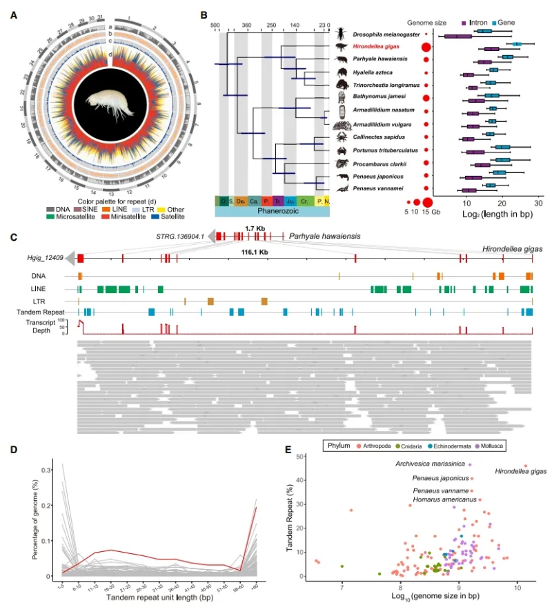 研究團隊利用PacBio?HiFi長讀長測序和Hi-C三維基因組技術(shù),成功組裝了H.?gigas的染色體水平的高質(zhì)量基因組(大小13.92?Gb)。基因組分析揭示了其兩大主要特征:內(nèi)含子延長和重復(fù)序列擴張。與近緣物種相比,H.?gigas的內(nèi)含子長度顯著增加,主要是由于重復(fù)序列的插入,尤其是串聯(lián)重復(fù)和長散在重復(fù)序列(LINEs)轉(zhuǎn)座子。H.?gigas基因組中71.98%為重復(fù)序列,主要為串聯(lián)重復(fù),占到基因組的46.03%,顯著高于其他無脊椎動物。特別是,與其他無脊椎動物基因組相比,H.?gigas基因組中長單元串聯(lián)重復(fù)序列(小衛(wèi)星,10-100?bp)的比例更高,其比例與無脊椎動物基因組大小正相關(guān)。這些重復(fù)的產(chǎn)生可能與深淵極端環(huán)境的適應(yīng)有關(guān)。