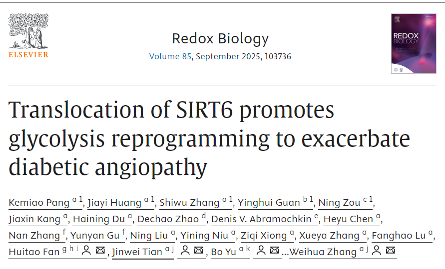 哈爾濱醫(yī)科大學(xué)張偉華教授和李水潔教授、哈爾濱醫(yī)科大學(xué)附屬第二醫(yī)院于波教授和田進(jìn)偉教授以及哈爾濱醫(yī)科大學(xué)附屬第一醫(yī)院范會(huì)濤教授在Redox Biology上發(fā)表題為“Translocation of SIRT6 promotes glycolysis reprogramming to exacerbate diabetic angiopathy”的研究論文。