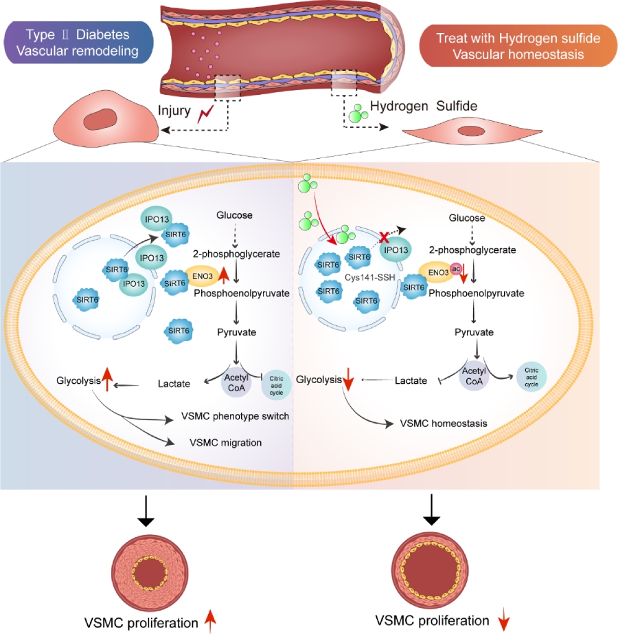 總體而言,該研究通過整合多組學(xué)分析、動(dòng)物模型驗(yàn)證和細(xì)胞功能實(shí)驗(yàn),全面揭示了細(xì)胞質(zhì)SIRT6-ENO3軸調(diào)節(jié)糖酵解重編程和VSMC增殖相關(guān)血管重塑的新機(jī)制。研究發(fā)現(xiàn)高血糖和高血脂通過氧化應(yīng)激和IPO13依賴的核輸出過程促進(jìn)SIRT6細(xì)胞質(zhì)易位,易位的SIRT6通過去乙?;疎NO3增強(qiáng)其酶活性,驅(qū)動(dòng)糖酵解重編程和血管平滑肌細(xì)胞異常增殖。更重要的是,外源性硫化氫通過恢復(fù)SIRT6第141位半胱氨酸的S-硫氫化修飾,抑制其細(xì)胞質(zhì)易位并減弱ENO3活性,從而改善糖尿病血管病變。