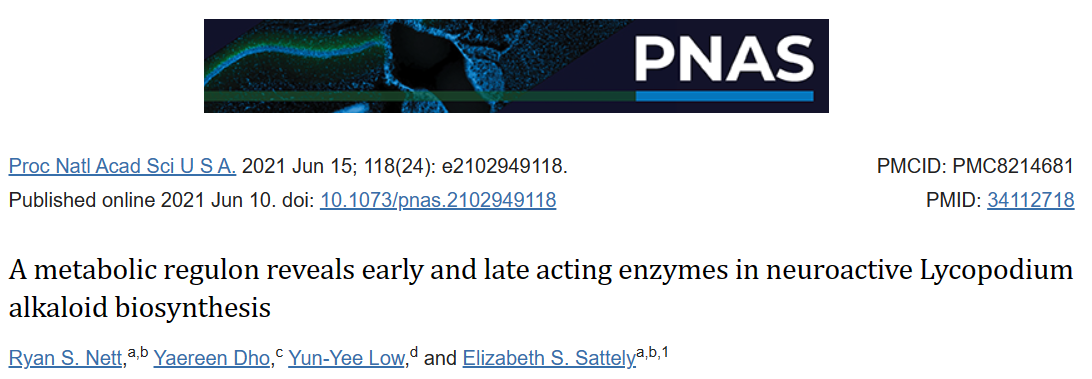 2021年6月,斯坦福大學(xué) Elizabeth S. Sattely 團(tuán)隊(duì)在國(guó)際頂尖學(xué)術(shù)期刊《美國(guó)國(guó)家科學(xué)院院刊》PNAS發(fā)表一項(xiàng)重要研究成果,題為:A metabolic regulon reveals early and late acting enzymes in neuroactive Lycopodium alkaloid biosynthesis。研究通過(guò)代謝組學(xué)和轉(zhuǎn)錄組學(xué)的方法,確定了一組發(fā)育受控的生物合成基因,或潛在的調(diào)節(jié)子,用于調(diào)控石松生物堿的生物合成。