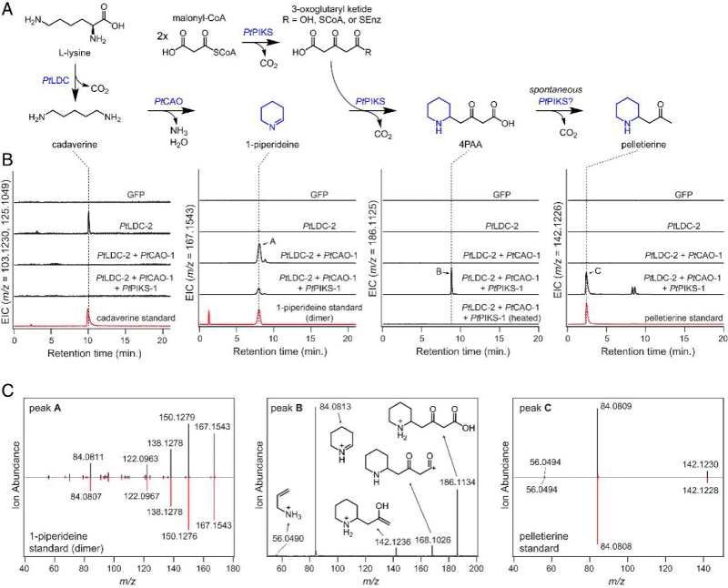 接下來(lái),推測(cè)通過(guò)向 1-哌啶聚合物中添加丙二酰輔酶 A 衍生的聚酮鏈以產(chǎn)生 4-(2-哌啶基)乙酰乙酸(4PAA),該酸可以脫羧產(chǎn)生peletierine(圖 1B)。聚酮底物的產(chǎn)生表明聚酮合酶(PKS)酶參與催化這種亞胺-酮縮合反應(yīng),并在石松生物堿的生物合成中起作用。進(jìn)一步分析揭示了兩個(gè)PKS候選基因(PtPIKS-1和PtPIKS-2),與PtLDC-1共表達(dá)基因之一(圖2C)。PtPIKS-1 PtPIKS-2與PtLDC-2 和PtCAO-1在煙草葉片中的瞬時(shí)共表達(dá)導(dǎo)致1-哌啶代謝物的消耗和幾種新化合物的產(chǎn)生。其中一種化合物具有與假定的石松生物堿前體peletierine相對(duì)應(yīng)的精確質(zhì)量數(shù) ([M+H]=m/z