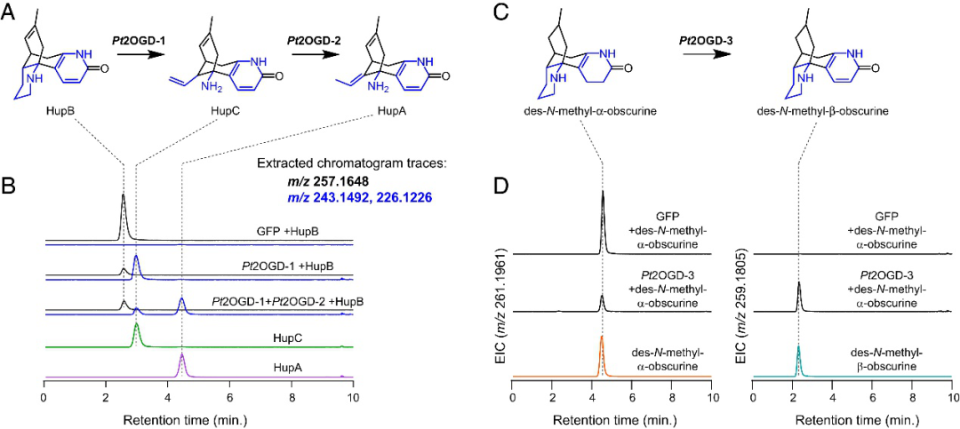 為進(jìn)一步研究其他下游生物合成途徑。特別是,兩種石松生物堿,des-N-methyl-α-obscurine(DNMAO)和des-N-methyl-β-obscurine(DNMBO),與HupB共享相同的碳骨架,可能是HupB的前體(圖 5)。因此作者通過(guò)與上述已知基因的高共表達(dá)分析及體外酶活驗(yàn)證實(shí)驗(yàn)發(fā)現(xiàn)另一種獨(dú)特的2OGD酶(Pt2OGD-3)能將DNMAO轉(zhuǎn)化為DNMBO(圖5),從而形成最終在HupA中發(fā)現(xiàn)的吡啶酮環(huán)。并且發(fā)現(xiàn)Pt2OGD-1和Pt2OGD-2可以依次作用于DNMBO,以產(chǎn)生假定的HupC和HupA的8,15-二氫同系物。Pt2OGD-1不作用 DNMAO,表明在DNMBO和HupB中發(fā)現(xiàn)的吡啶酮環(huán)的存在對(duì)Pt2OGD-1底物結(jié)合和/或催化活性至關(guān)重要,但是參與其中的去飽和酶尚未被發(fā)現(xiàn)。