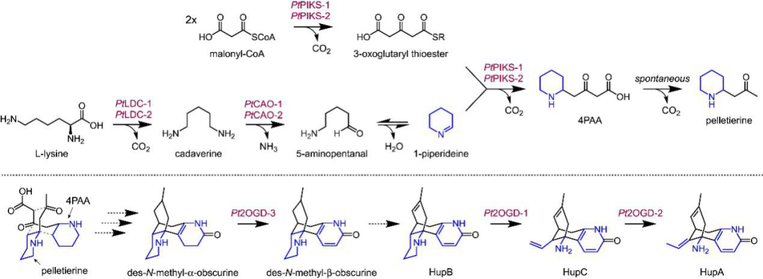 目前研究尚未證實(shí) HupA 生物合成中的任何下游中間體,但從各種苔蘚物種中分離生物堿可能與兩個(gè)含8碳哌啶的亞基摻入石松生物堿的生物合成相關(guān)(圖 1B)。但是詳細(xì)的代謝合成機(jī)制還不清楚。作者通過(guò)與4PAA/peletierine生物合成的 3 個(gè)高度共表達(dá)基因分析,作者發(fā)現(xiàn)了富集最顯著的一類酶:Fe(II)/2-氧代戊二酸依賴性雙加氧酶(2OGDs)(圖2B,C)。作者將這些高度共表達(dá)的2OGD作為下游石松生物堿代謝途徑中的強(qiáng)候選基因。