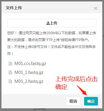上傳文件:選 擇 文 件 上 傳 , 點(diǎn) 擊 “ 上 傳 ” , 選 擇 下 載 好 的 原 始 數(shù) 據(jù)(\Needed_Data\Rawdata\01.Rawdata 路徑下的所有文件),點(diǎn)擊確定即可等待數(shù)據(jù)上傳完成。