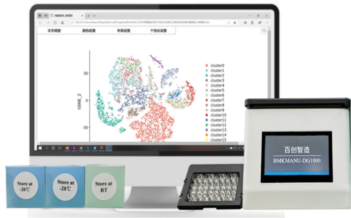 為了突破單細胞試劑耗材及儀器長期以來的國外技術(shù)壟斷,降低單細胞應(yīng)用的成本,讓單細胞技術(shù)能夠惠及更多的科研群體,經(jīng)過多年潛心研發(fā),百創(chuàng)智造發(fā)布自主研發(fā)的極速單細胞微液滴系統(tǒng)-百創(chuàng)DG1000。百創(chuàng)DG1000是基于微流控、油滴包裹和Barcode標(biāo)記等技術(shù)來實現(xiàn)高通量的細胞捕獲。除了儀器以外,百創(chuàng)DG1000還有配套的2×4的獨立芯片及配套試劑盒(圖4)。