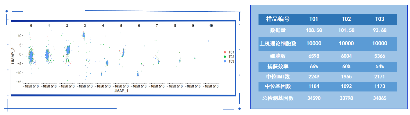 PBMC重復(fù)性檢測:將相同的PBMC細胞懸液分3份,通過3個不同實驗人員,用3臺百創(chuàng)DG1000儀器,獨立進行單細胞測序,得到了幾乎一致的細胞聚類分群結(jié)果,證明百創(chuàng)DG1000具有很好的可重復(fù)性及穩(wěn)定性(圖5)。