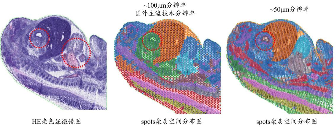 大鼠胚胎亞細胞分辨率實測數(shù)據(jù)展示:與100μm分辨率(主流技術(shù)平臺)對比,高分辨率(~50μm)下HE染色組織形態(tài)學(xué)與spots聚類空間分布圖重合度更高,精準(zhǔn)識別空間基因表達的異質(zhì)性和組織區(qū)域的特異性(圖7)。