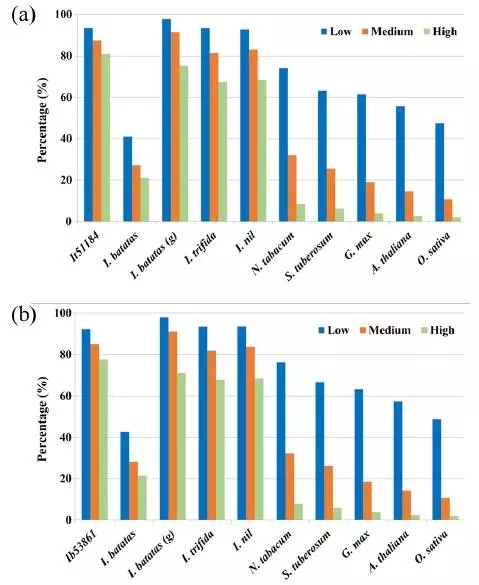 為了評估甘薯、野生甘薯的轉錄本和其他植物基因的相似性,我們比較了甘薯、野生甘薯與其他植物的開源CDS數(shù)據(jù)庫,包括紅苔藤、野生甘薯、牽牛花、煙草、馬鈴薯、大豆、擬南芥和水稻。結果表明甘薯和野生甘薯大多數(shù)的轉錄本都是同源的,說明這兩個物種擁有一個大致相同的基因庫。觀察高比例的轉錄本發(fā)現(xiàn),盡管這些物種中的大量基因在進化過程中存在著巨大的差異,但仍然共有一些短的motif,說明這些基因在進化上顯示出高度的保守性。
