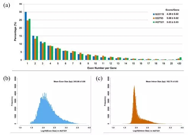 三代測序得到的全長cDNA對于研究基因的結構非常有用,例如分析外顯子-內含子的結構。我們隨機挑選了50個基因進行比較,發(fā)現(xiàn)這些基因含有的外顯子數(shù)目在甘薯、野生甘薯和擬南芥三個植物中的分布是相似的。