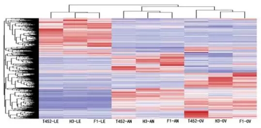 因為T452和H3的雜交F1代表現(xiàn)出了優(yōu)良性狀,因此可以通過轉錄組測序研究性狀差異的原因。取T452,H3及雜交F1代的三種不同組織分別進行轉錄組測序,包括減數(shù)分裂階段的花藥、減數(shù)分裂階段的子房、開花階段的旗葉??偣矞y了548M clean reads,平均有89.06%的reads可以比對到參考基因組上,其中93.45%都是比對到唯一位置上。三個生物學重復之間的相關性都達到了0.8以上。用qRT-PCR的方法對12個差異表達基因(DEG)的表達量進行了驗證,結果與轉錄組測序的結果一致。對不同樣品進行層次聚類分析表明,相同組織的樣品總能聚到一塊(圖2)。