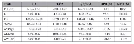 表一:T452與H3雜交F1代的雜種優(yōu)勢。HPH:高親優(yōu)勢;MPH中親優(yōu)勢;PH:植株高度;EP:單株谷粒數(shù);FG:單花谷粒數(shù);SS:結實率;GYP:單株產量;GL:10谷粒長度;GW:10谷粒寬度。