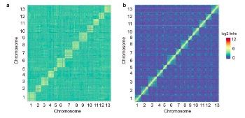 本研究使用Illumina HiSeq和PacBio Sequel測序平臺,用Hi-C、光學(BioNano Irys)和遺傳圖譜輔助,進行雌性構樹的基因組組裝。獲得染色體水平的高質量構樹基因組,其大小為386.93Mb,scaffold N50是29.48Mb,有99.25%(357.56Mb)的基因組被錨定在13條染色體上,Hi-C熱圖評估(見圖1)。一共預測了30,512個基因,98.09%與已知基因同源并且得到了功能上的注釋。