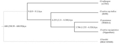 利用OrthoMCL軟件檢測WR04-6、R498、Nipponbare和W1943(O. rufipogon)間核心的、非必須的和共有的基因家族。在WR04-6中鑒定到了909個擴張的基因家族,并且通過通路分析顯示,這些基因在光合作用和呼吸作用中顯著富集(p<0.01),例如氧化磷酸化、光合作用和核糖體的KEGG途徑,考慮其可以作為遺傳改良的信號。以O. barthii作為外群構建的進化樹顯示WR04-6與粳稻祖先的分化時間估計在3,706ya(1,235ya-6,326ya),見圖4。