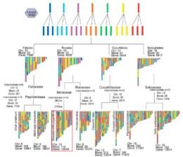 苦蕎與擬南芥、可可、大豆、葡萄、楊樹、馬鈴薯、番茄以及單子葉的水稻和玉米構建系統(tǒng)發(fā)育進化樹,見下圖。此外還進行基因家族聚類分析,找出共同和特有的基因家族。