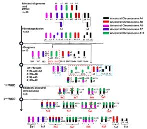AP85-441基因組的組裝顯示了S. spontaneum的染色體數(shù)目從10降到8,而這與頻繁復制的古復制染色體對相關,通過與高粱的聚類比對,發(fā)現(xiàn)高粱祖先5號染色體和8號染色體同源物經歷了染色體裂變(見圖2)。SbChr05(A12)的祖先染色體斷裂分為兩個主要部分,即C5S(A12S)和C5L(A12L),分別轉移到SbChr06(A2)和SbChr07(A5)的祖先染色體;SbChr8(A11)的祖先染色體斷裂為兩個主要的部分,即C8S(A11S)和C8L(A11L),分別轉移到SbChr09(A6)和SbChr02(A7 + A9)的祖先染色體中。SbChr8和SsChr5之間及SbChr5和SsChr7之間近乎同源的短片段是在高粱與甘蔗分化前,高粱SSA形成于13.4 MYA同源基因的殘留物,同時發(fā)現(xiàn),S5中較小的SSA區(qū)域和S8中SSA的較大區(qū)域在重排的AP85-441基因組中也是保守的。