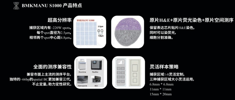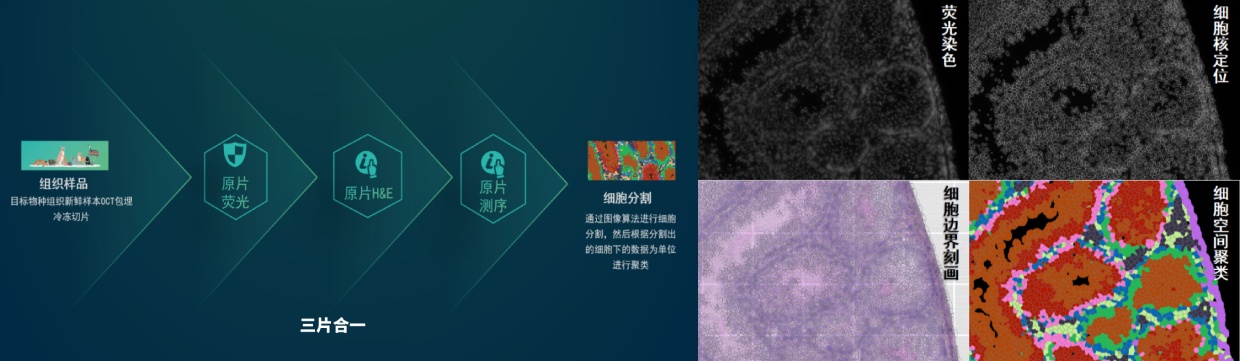 百創(chuàng)智造S系列空間轉(zhuǎn)錄組細(xì)胞分割實(shí)現(xiàn)原理: 三圖合一 百創(chuàng)智造基于S系列空間芯片的底層設(shè)計(jì),開發(fā)出了自己的核心技術(shù),可以得到完全沒有錯(cuò)誤的原片熒光圖像以及H&E圖像且與芯片完全對(duì)齊?;跓晒膺M(jìn)行細(xì)胞核的定位刻畫細(xì)胞核的邊界;基于HE的校準(zhǔn)輔助刻畫細(xì)胞的邊界,通過邊界信息映射到芯片上,提取相應(yīng)位置的測序數(shù)據(jù),實(shí)現(xiàn)精準(zhǔn)的單細(xì)胞分割。