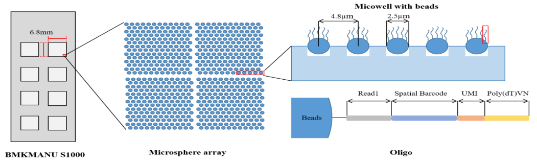 百創(chuàng)S1000(BMKMANU S1000)是由百邁客生物設(shè)計并研發(fā)而來的基于微孔微珠上Spatial Barcode實現(xiàn)對組織切片mRNA分子捕獲的亞細胞級空間轉(zhuǎn)錄組芯片。百創(chuàng)S1000可以廣泛應(yīng)用于生物器官發(fā)育、神經(jīng)科學(xué)、免疫感染、脅迫應(yīng)激、生物遺傳進化等生命科學(xué)領(lǐng)域的研究。